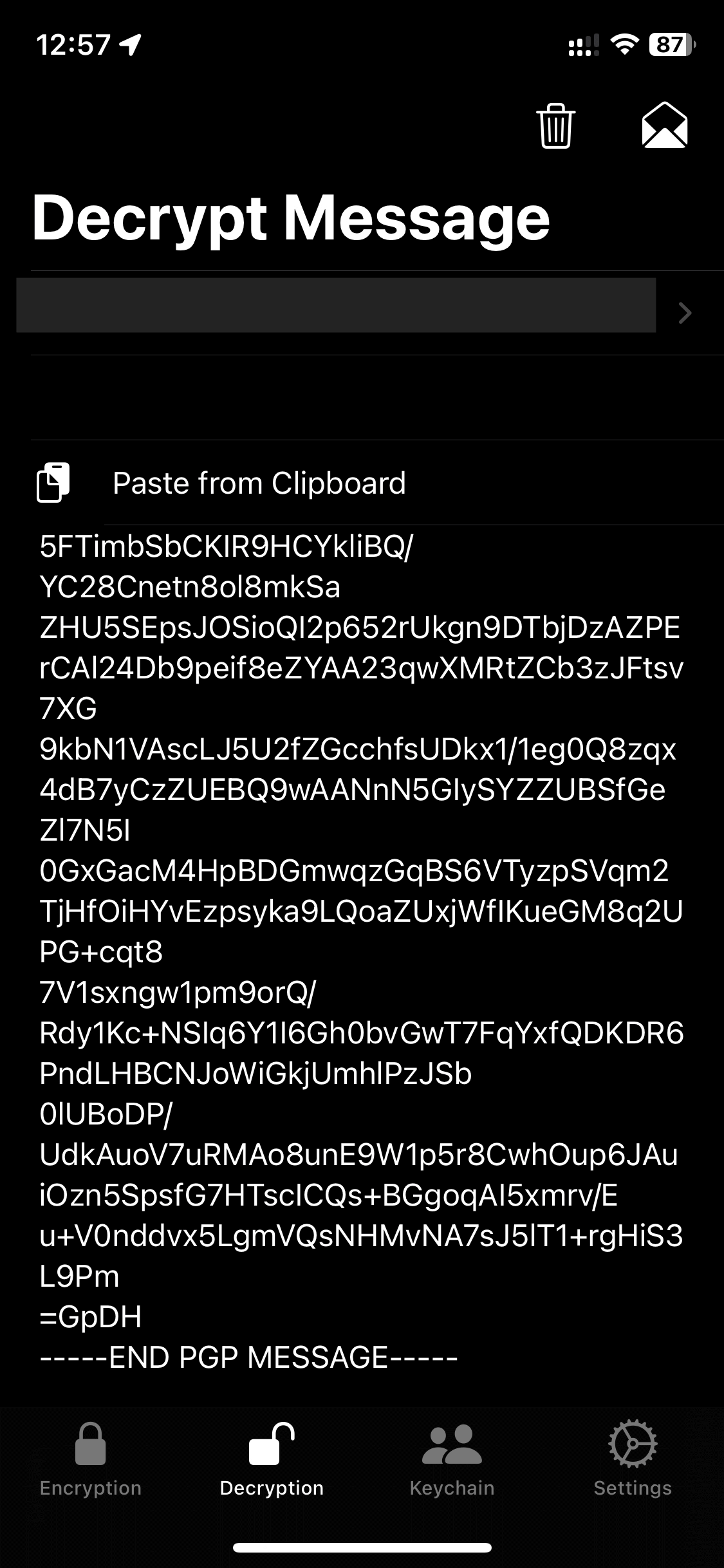 L'appli PGPro permet de chiffrer/déchiffrer un email en passant de l'appli tierce à celle de messagerie assez facilement. Le prérequis est la génération d'une paire de clé à l'aide du menu "Keychain" et l'intégration des clés publiques de vos destinataires.